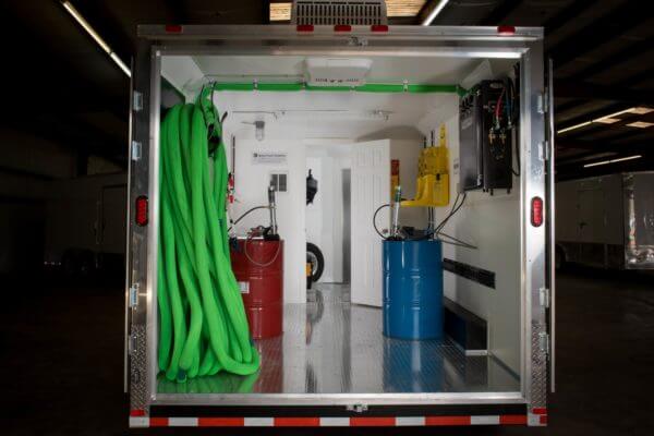 - A/C, Wall Heater, Closed Cell Insulated Walls & Ceiling & Floors Diamond Plate Floors, Gloss White Plywood Walls, White Ceiling, Trim Out, E-Track Barrel Bracing, Work Bench w/ Vise Mounted), Spray Hose Rack, Fresh Air Hose Rack