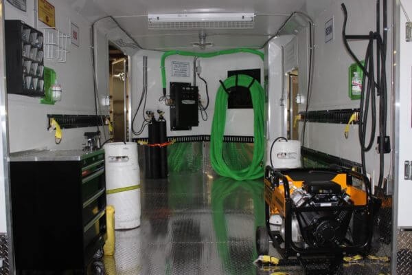 - Closed Cell Insulated Walls & Ceiling & Floors Diamond Plate Floors – Gloss White Plywood Walls – White Ceiling – Trim Out – E-Track Barrel Bracing – Work Bench w/ Vise Mounted – Spray Hose Rack – Fresh Air Hose Rack